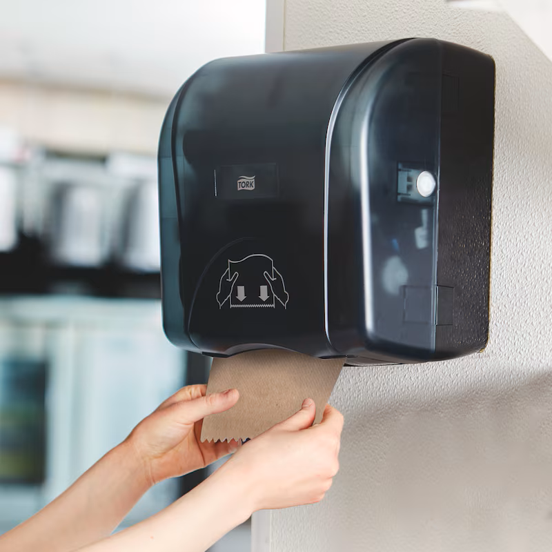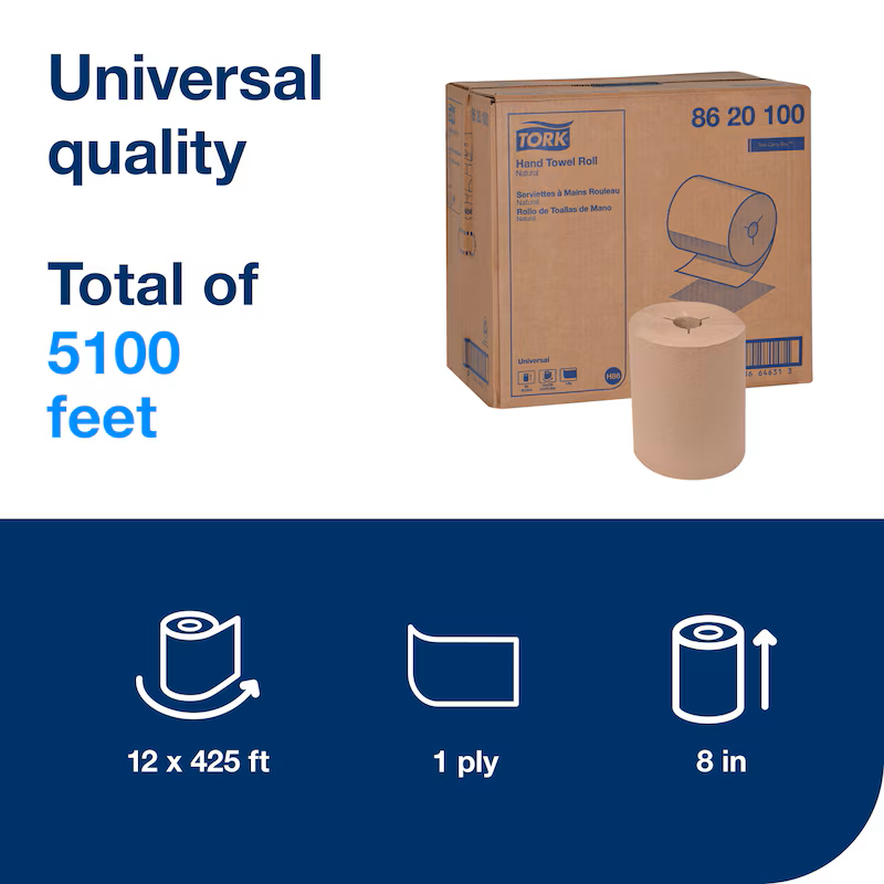 Tork Universal Hand Towel Roll satisfies those who prefer to purchase quality towels produced with methods less harmful to the environment. This roll towel is 100% recycled and meets EPA guidelines with a minimum of 40% for post-consumer wastepaper content. Controlled roll towels provide added value and benefits such as controlled usage and cost savings when combined with controlled roll towel dispensers. This roll towel is best suited for healthcare or other applications seeking a small footprint roll towel solution.