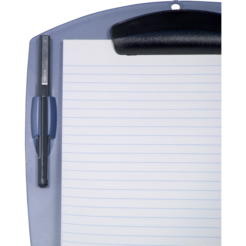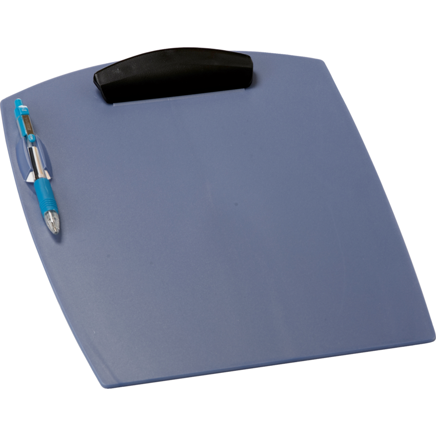 Extra wide surface to prevent page curling. Washable hard plastic surface is safer in medical and food processing environments. Contains a minimum of 50% post-consumer recycled material. Features a built-in pen holder. Letter size. Poly. Pearlized Blue.