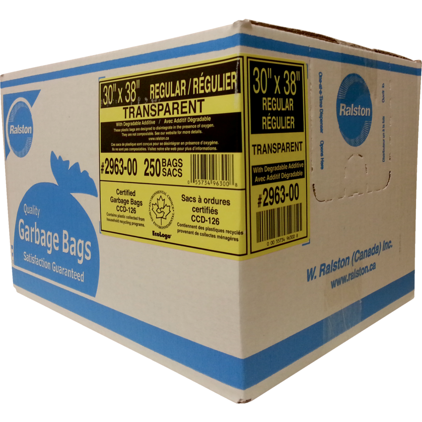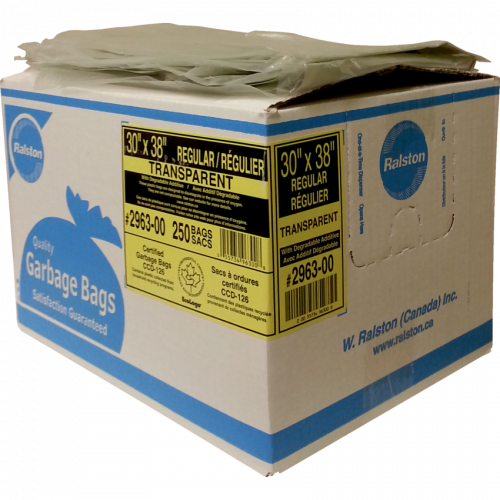 These bags allow for significant downgauging while still maintaining superior characteristics. They contain a degradable additive designed to disintegrate in the presence of oxygen. Contains a minimum of 10% post-consumer recycled material. Regular. 30" x 38". Clear. 250/ctn.