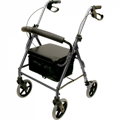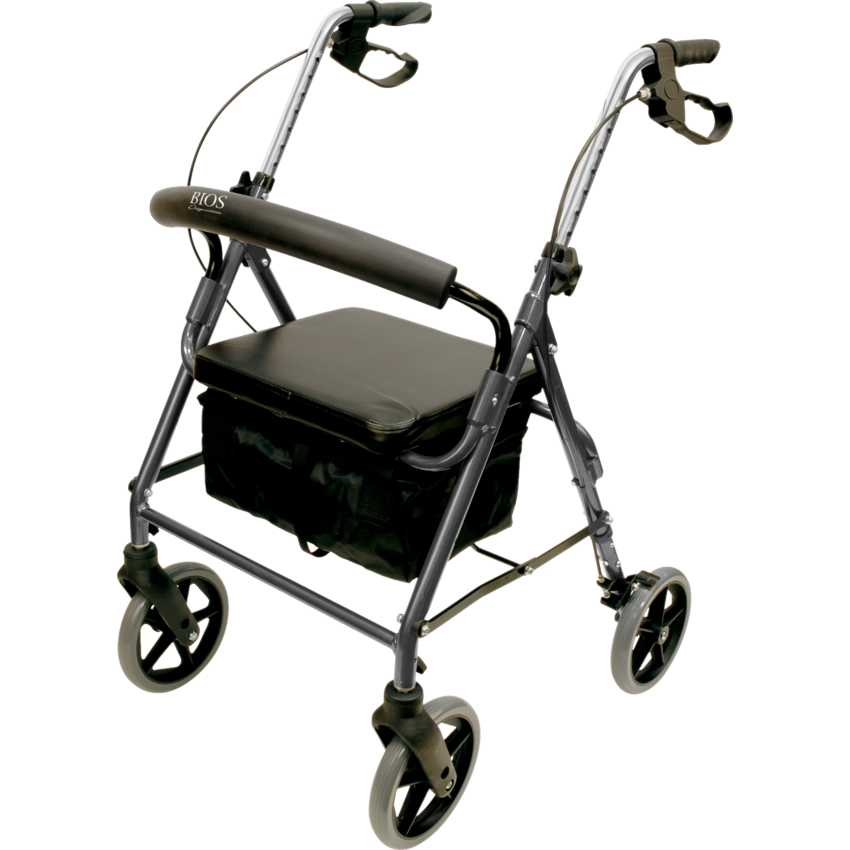Made of lightweight aluminum. Padded seat and backrest designed for comfort. Easy fold frame ensures easy transport and storage. Adjustable height from 31-1/2" to 35". Ergonomic handles and removable basket. Supports up to 300 lbs.