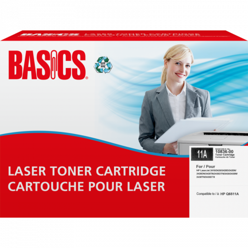 Basics® Brand cartridges are manufactured at North American ISO 9001:2000 registered facilities using returned, original equipment cartridges. These cartridges are designed, engineered and manufactured to meet OEM performance while ensuring top quality and consistent output. OEM# 11A. Basics®. HP LaserJet 2410, 2420, 2420D, 2420N, 2420DN, 2420TN, 2420DTN, 2430, 2430N, 2430TN, 2430DTN. Contains a minimum of 81% post-consumer recycled material. Yields 6,000 pages. Black.