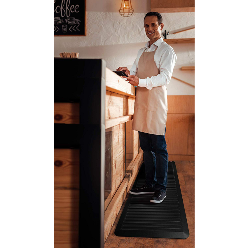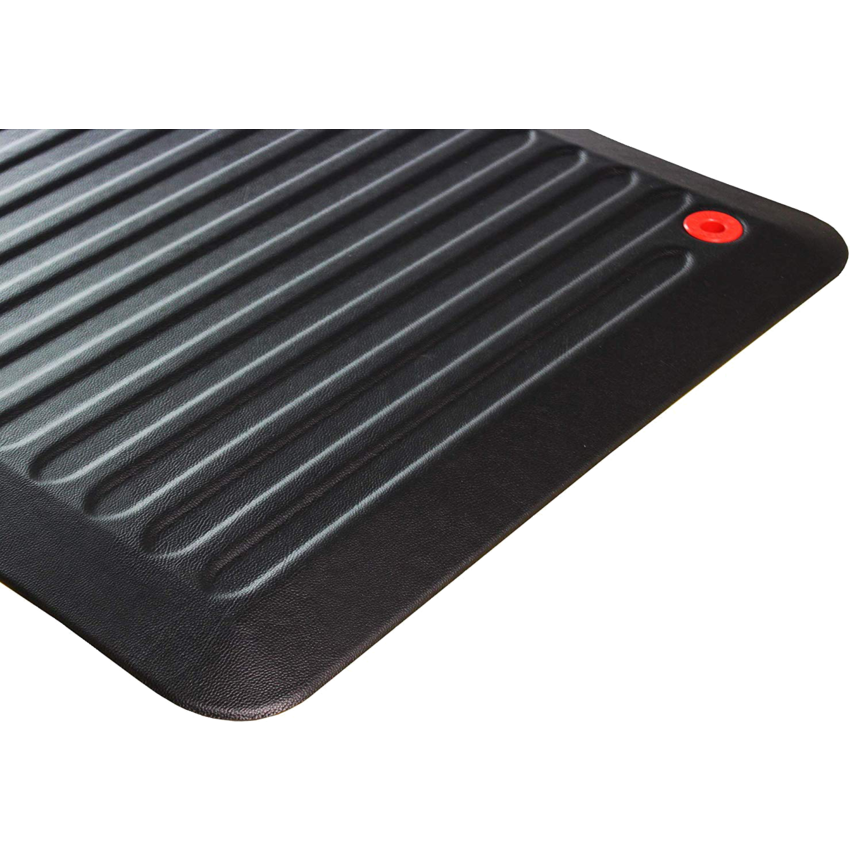 Designed to reduce pressure on the body by up to 40%, dramatically reducing strain on feet, legs, knees and back joints caused by prolonged standing. Perfect for shared workstations. Contoured, curl-proof edge ensures the mat remains flat and features a 20° bevelled edge for maximum safety. Anti-slip base and a convenient hook hole for hanging when not in use. 4/5" thick polyurethane. 23" x 67". 10-year warranty. Black.