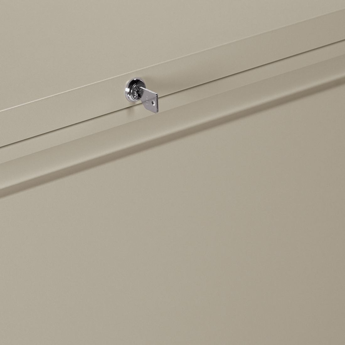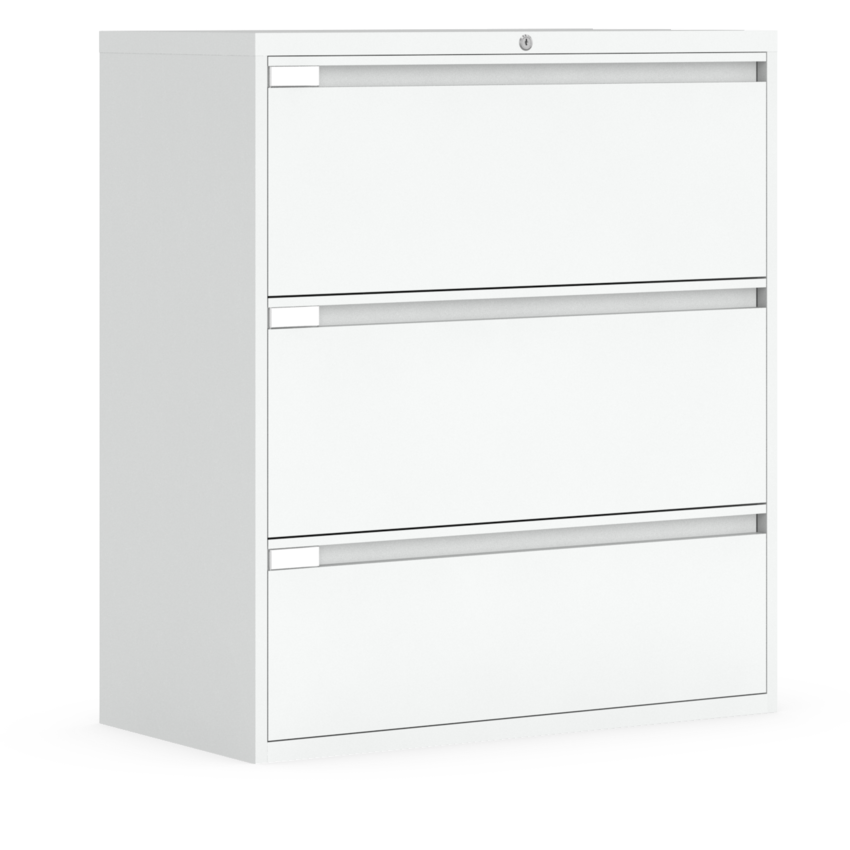 These solidly constructed, stylish fixed front lateral filing cabinets have a variety of great features. Full width, looped, full pull handles and levelling glides ensure drawers open easily. Cam locks and side-to-side bars are standard. Available in a va. 3-Drawer. 36"W x 18"D x 40-1/2”H. Designer White. Lifetime warranty.