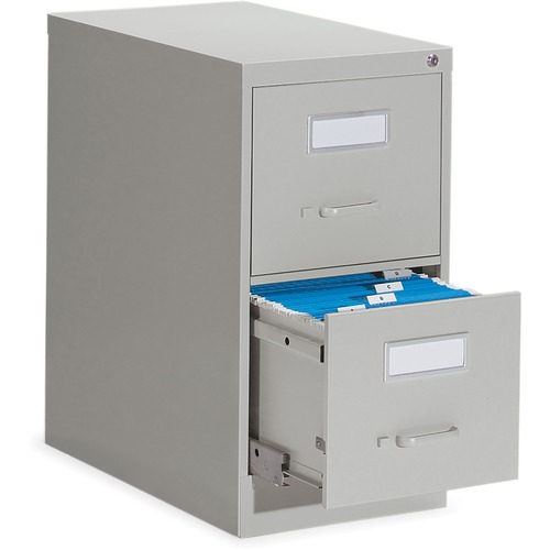 High drawer sides accommodate hanging files. Full suspension provides smooth drawer movement and the drawers have a pull handle with safety thumb latch. File includes an adjustable and removable follower block and a lock. 2-Drawer. 15"W x 26-9/16"D x 29"H. Letter size. Grey.