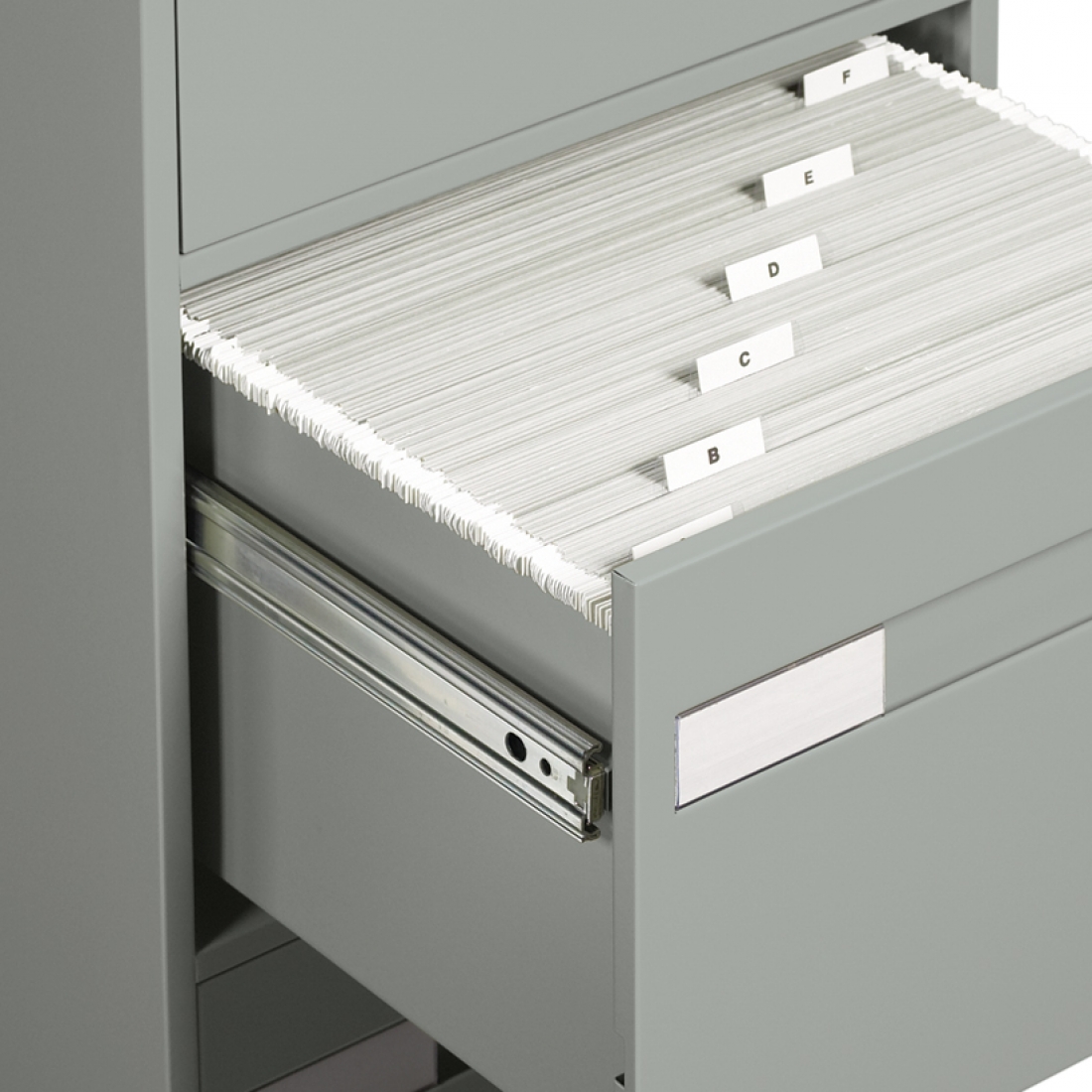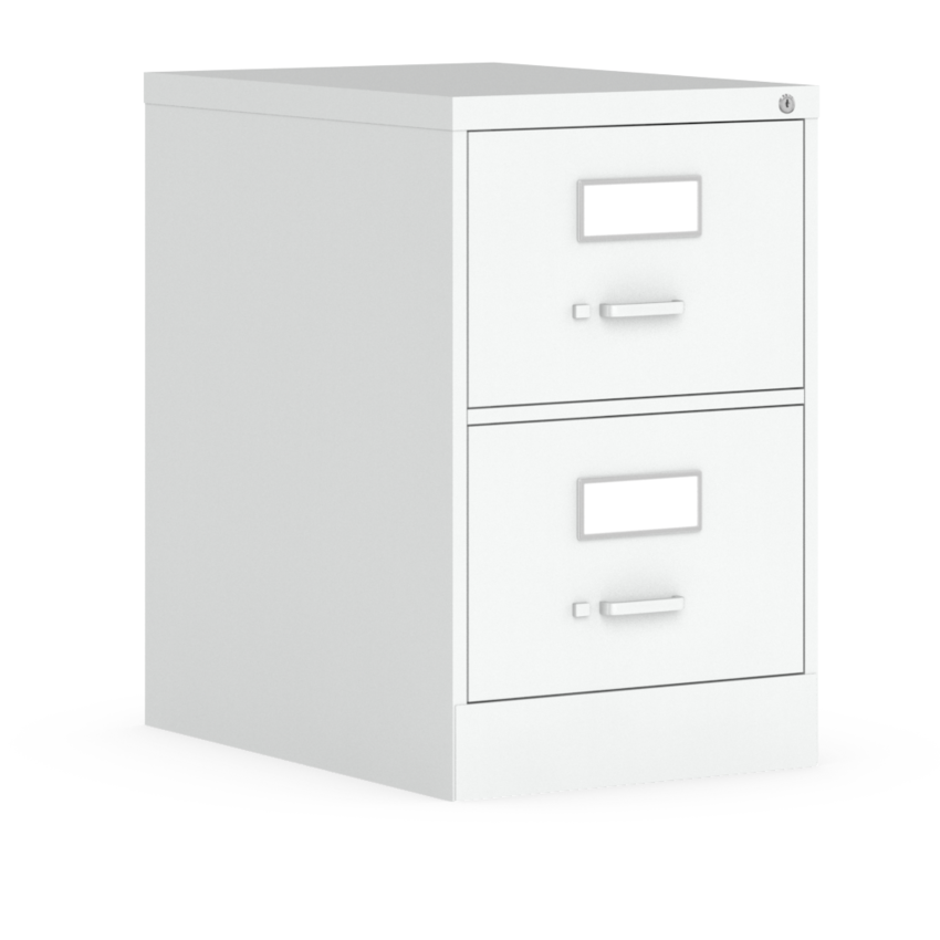 High drawer sides accommodate hanging files. Full suspension provides smooth drawer movement and the drawers have a pull handle with safety thumb latch. File includes an adjustable and removable follower block and a lock. 2-Drawer. 18"W x 26-9/16"D x 29"H. Legal size. Designer White.