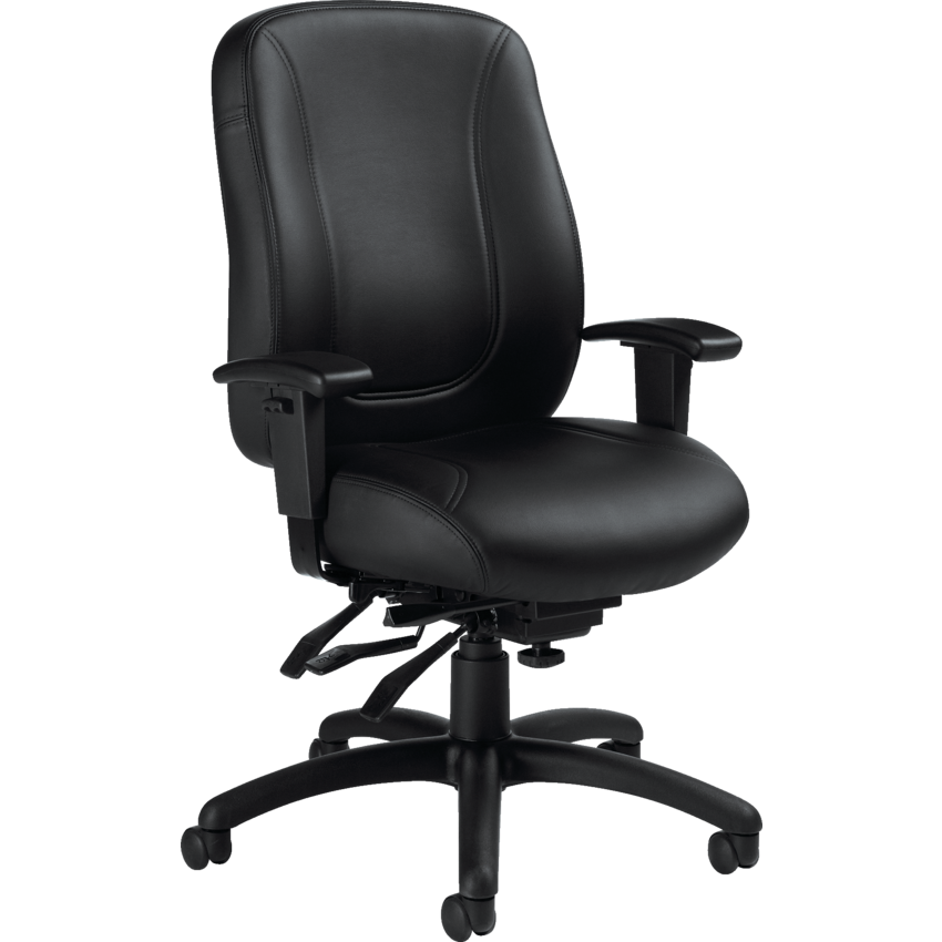 Long term comfort seat, memory foam top. High Back. Pneumatic seat height adjustment. Seat range from 17" to 21". Infinite position back and seat angle adjustment, including forward tilt. Infinitely adjustable seat angle. Waterfall seat edge. Adjustable back angle. Ratchet back and height adjustment. Infinite position tilt lock and tilt tension adjustment. Tilt tension adjustment. Height and width adjustable arms. Dual wheel carpet casters. 63 lbs. 26"W x 24-1/2"D x 42"H. Assembly not included. Leather. Luxhide. Black.