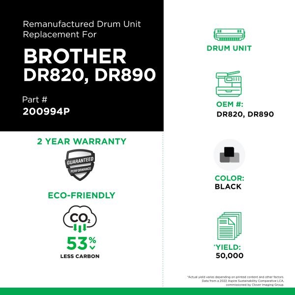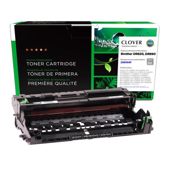 Designed to be a true quality alternative to the OEM while offering significant savings. Manufactured in ISO 9001:2008 certified North American facilities. 100% guaranteed to meet or exceed OEM performance. OEM# DR820. Clover Imaging. Brother DCP-L5500DN, DCP-L5600DN, DCP-L5650DN; HL-L5000D, HL-L5100DN, HL-L5200DW, HL-L5200DWT, HL-L6200DW, HL-L6200DWT, HL-L6250DW, HL-L6300DW, HL-L6400DW, HL-L6400DWG, HL-L6400DWT, HL-L6400DWX; MFC-L5700DW, MFC-L5800DW, MFC-L5850DW, MFC-L5900DW, MFC-L6700DW, MFC-L6750DW, MFC-L6800DW, MFC-L6900DW, MFC-L6900DWG, MFC-L6900DWX. Yields 50,000 pages. Black.