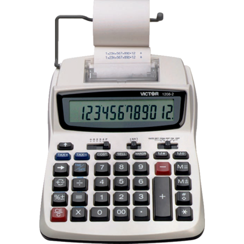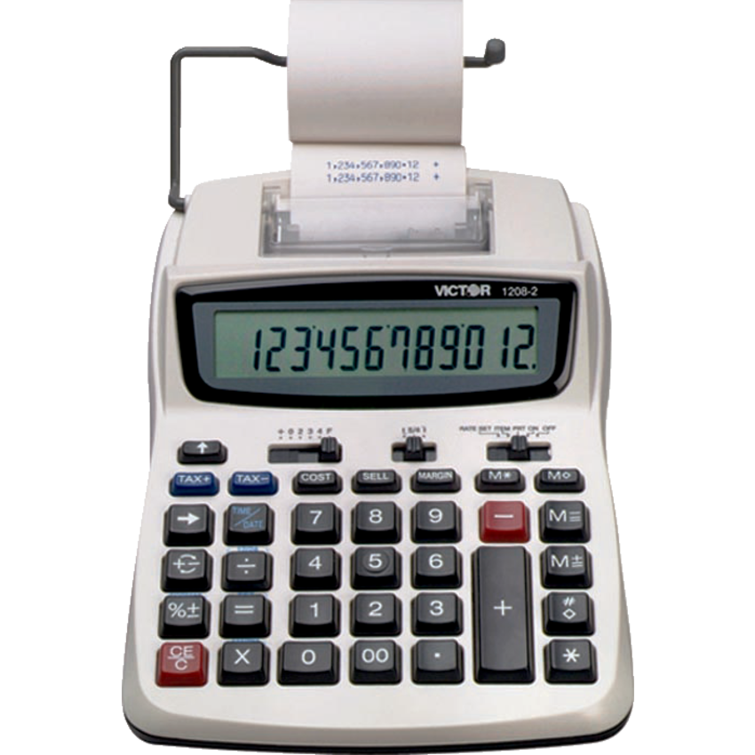 Dual power (AC adaptor included). 12-digit display. Prints 2.3 lines per second. 2-colour printout. Cost/Sell/Margin. Time/date, automatic tax keys, item count, date/non-add key, change sign, percent, backspace and 4 key independent memory. 6"W x 7-1/2"D x 1-1/2"H.