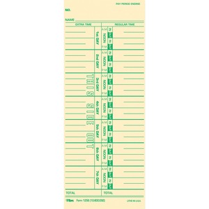 Weekly time cards feature numbered days and seven-day time period to record regular time and overtime. Extra-heavy, 143 lb. manila stock is printed in green ink on the front side. Time card replaces 10-800292, 1950-9305, 30, 1912R and K14-36971D. Time cards are designed for use with Acroprint 125R, 150R, ES700, ES900, ESP180, 175TR; Cincinnati 1000, 10000; Lathem 900E, 1200, 1500E, 2000, 4000, 5000EP; Simplex KCF, KCG, JCG, JCP, 2500; and Stromberg 250R.