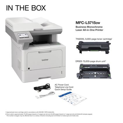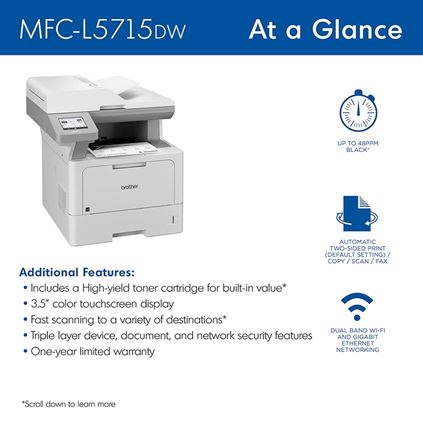 The Brother Workhorse MFC-L5715DW business monochrome laser printer is a great choice for busy offices and small workgroups that need low-cost printing, versatile paper handling, advanced security features, and reliable, high-quality output. This high-performance all-in-one printer helps to increase productivity with fast print and copy speeds up to 48ppm. Delivers built-in value with an included 6,000-page toner cartridge and low-cost printing by using the TN920UXXL Brother Genuine ultra high-yield replacement toner cartridge. Triple Layer Security features help to limit document and device access and protect against network intrusions. Offers expandable paper capacity that is scalable as your business needs grow. Quickly scan multi-page documents to a wide variety of destinations using the 50-page capacity auto document feeder. The 3.5” touchscreen display allows for the creation of customized shortcuts to your most frequently used workflows. The MFC-L5715DW also offers flexible connectivity with built-in Gigabit Ethernet and dual band wireless networking, plus convenient mobile device printing to meet mobile workforce demands.