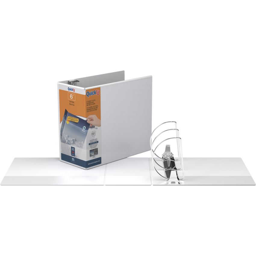 Customize the front cover and spine at the same time with a wraparound, easily loaded sheet. Rings mounted on back to allow pages to lie flat. See quickfitbinders.com for easy to use templates. Features ink transfer-resistant overlay. Interior front and back cover pockets. PVC free polypropylene material. 6" capacity, with locking rings. White.