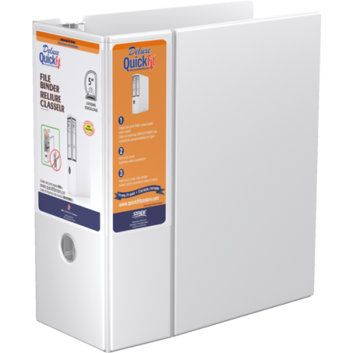 Extra-large wrap-around label can be printed on 8-1/2" x 11” paper. Back mounted rings allow pages to lie flat. Finger hole in spine for easy removal from shelf. See quickfitbinders.com for easy to use templates. Locking angle rings. Contains a minimum of 36% post-consumer recycled material. Polypropylene. 5" capacity. White.