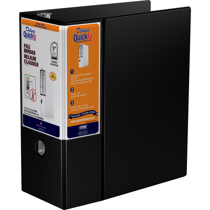 Extra-large wrap-around label can be printed on 8-1/2" x 11” paper. Back mounted rings allow pages to lie flat. Finger hole in spine for easy removal from shelf. See quickfitbinders.com for easy to use templates. Locking angle rings. Contains a minimum of 36% post-consumer recycled material. Polypropylene. 5" capacity. Black.