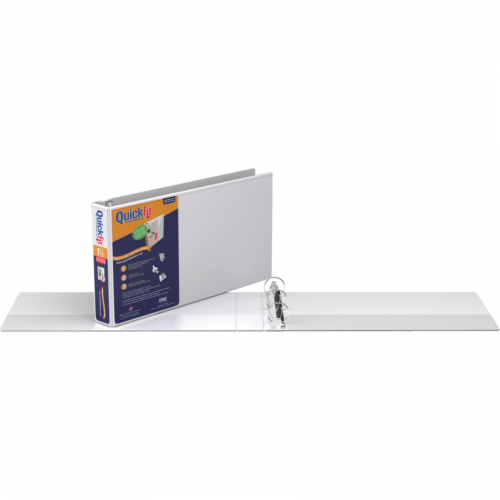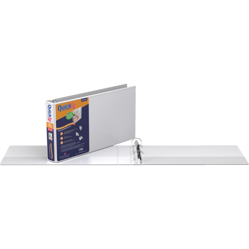 Unique overlay design allows a single sheet to create one-piece custom insert that wraps around spine to front cover. Back mounted rings allow pages to lie flat. See quickfitbinders.com for easy to use templates. Features ink transfer-resistant overlay on front cover, spine and inside pocket. 3 rings. Polypropylene material. 1-1/2" capacity. 8-1/2" x 14". White.