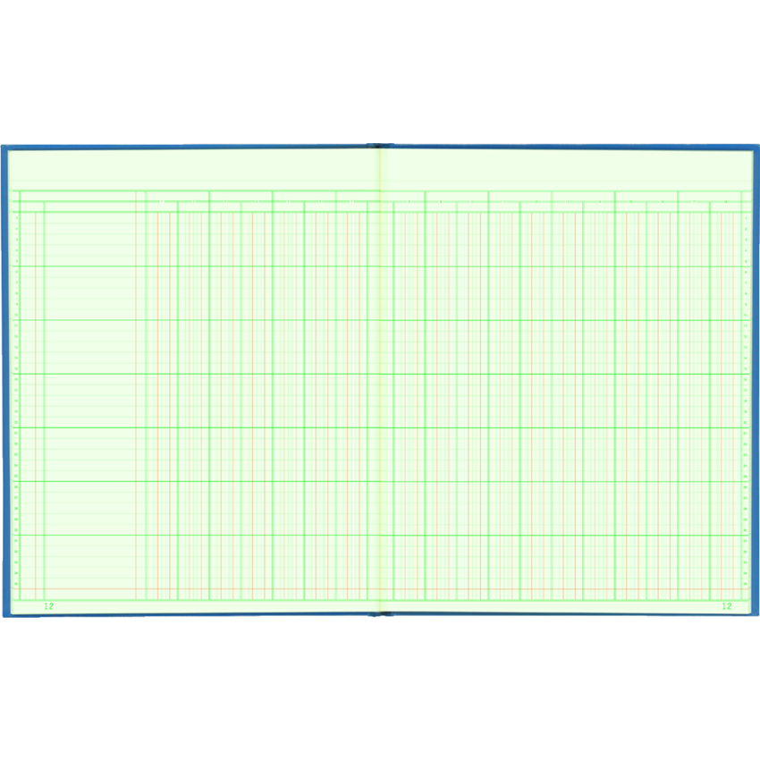 Green tinted paper with green and brown rulings and a perforated, tear-off heading section to eliminate repetitious writing. Contains a minimum of 50% post-consumer recycled material. FSC Certified®. Perfect bound. Hard cover. 18 Columns. Double page. 80 numbered pages. 12-1/4” x 9-7/8”.