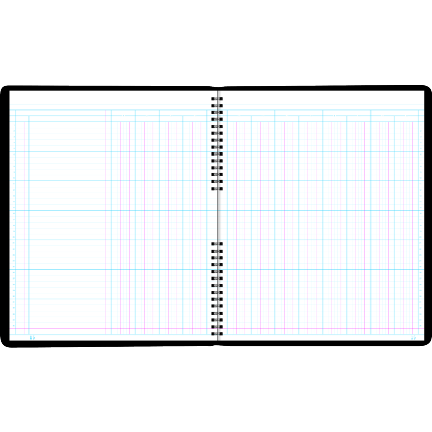 Pages with perforated, tear-off heading section to eliminate repetitious writing. Feint rulings. Contains a minimum of 50% post-consumer recycled material. FSC® Certified. Split twin wire bound. Flexible cover. White paper with red and blue ruling, numbered. 12 Columns. Double page. 80 pages. 12" x 10".