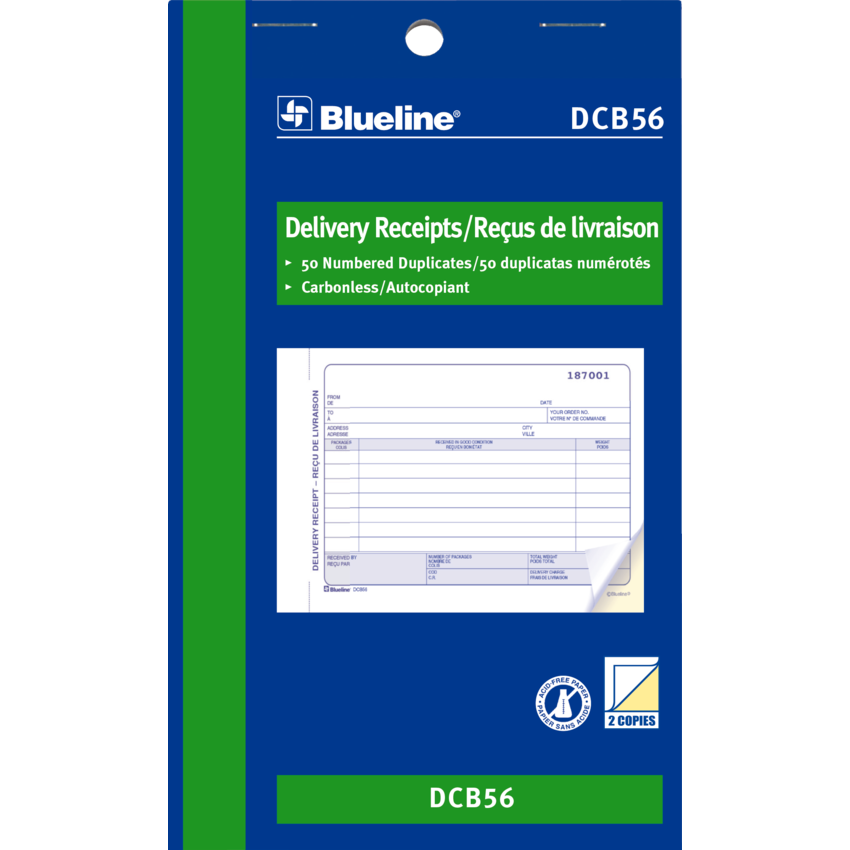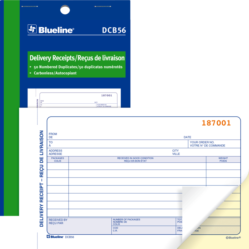 Wraparound cover to prevent write-through on subsequent forms. First copy is white, second copy is yellow, third copy is pink (where applicable). First dimension given is the bound side. Delivery Receipts Book. 2-part. 50 numbered sets per book. 4-1/4” x 7”. Bilingual.