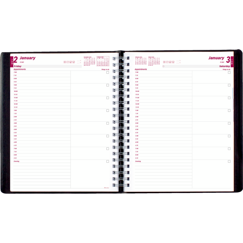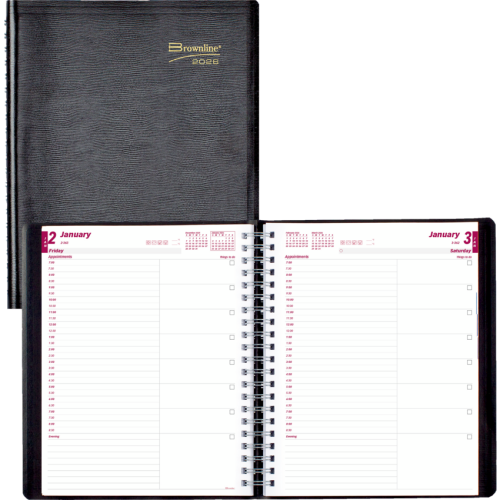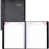 FSC® Certified. Contains a minimum of 50% post-consumer recycled material. Twin wire bound. Soft, lizard-like cover. 1 page per day. 7:00 a.m. to 8:30 p.m. in 1/2 hour intervals. Features tear off corners, space for evening appointments, “Things to do” section, and telephone address section. 11” x 8-1/2”. English. Black.