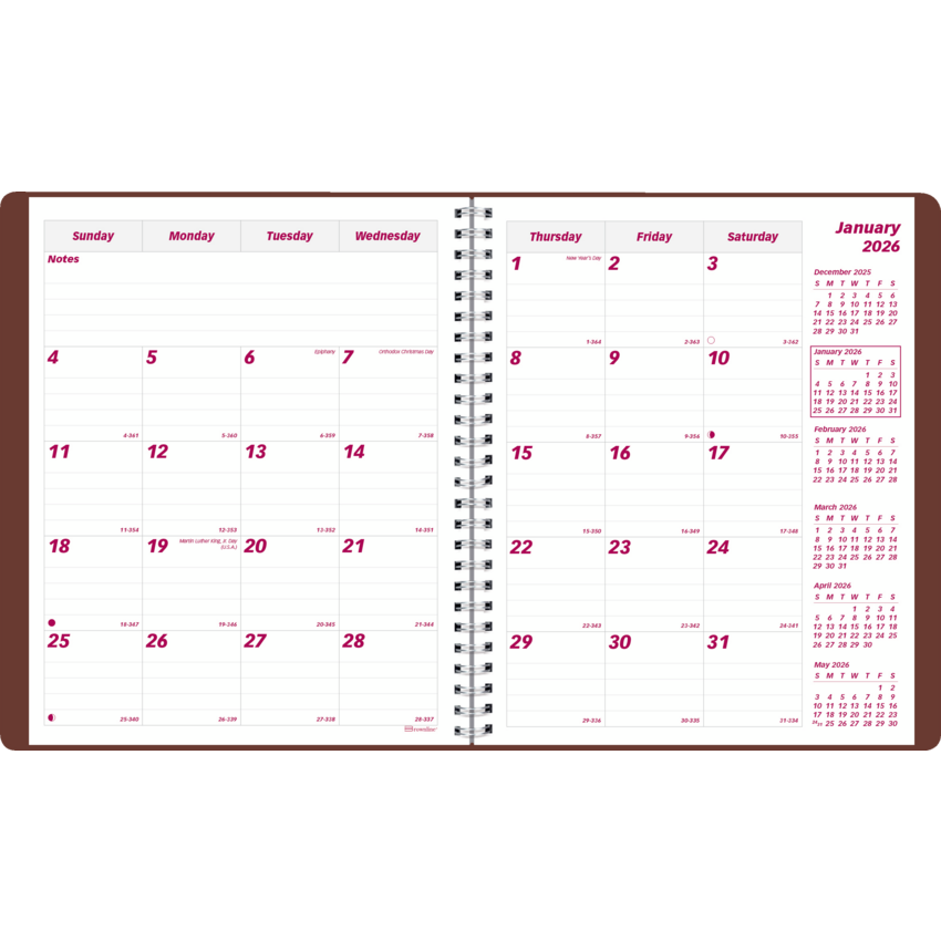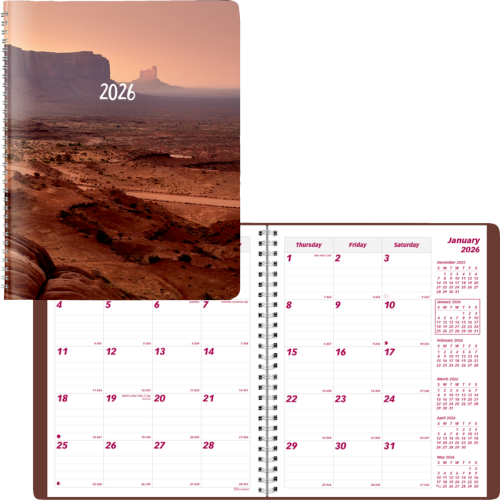 Contains a minimum of 50% post-consumer recycled material. FSC® Certified. Twin wire bound. Soft printed cover. 1 month per spread, 1 ruled block per day. 14 months, December to January. Past, current, and following 4 reference months on each spread. 8-7/8" x 7-1/8". English. Blue.