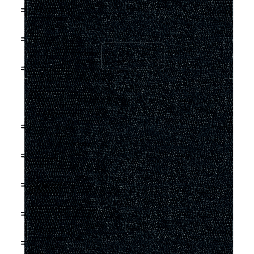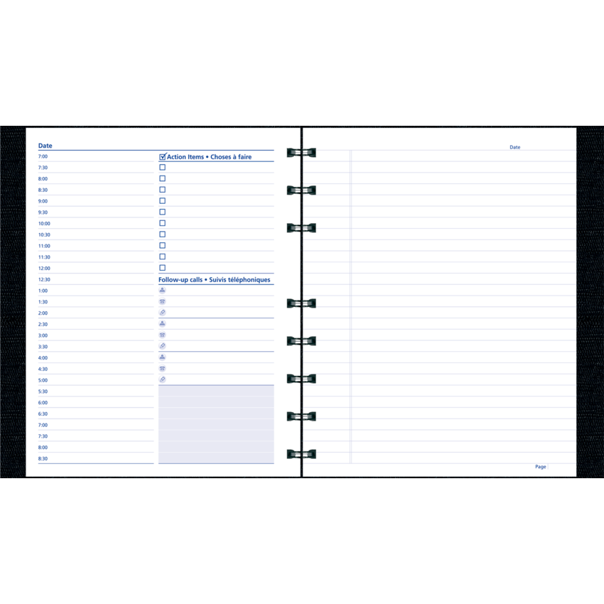 Planner page on left with ruled page on right side. Refillable with MiracleBind™ sheets. Contains a minimum of 50% post-consumer recycled material. FSC® Certified. Hard, lizard-like cover. Twin wire bound. 7:00 a.m. to 8:30 p.m. in 30-minute intervals. 192 pages. Self-adhesive tabs, index sheet, complete utility section and storage pocket. 9-1/4" x 7-1/4". Bilingual. Black.