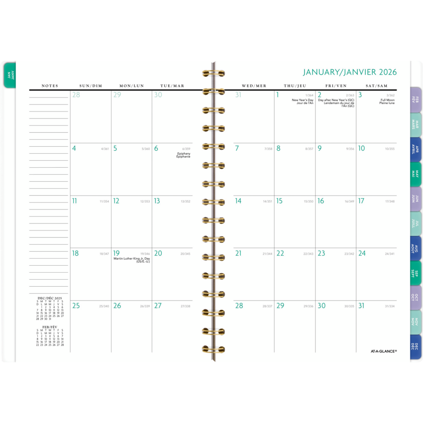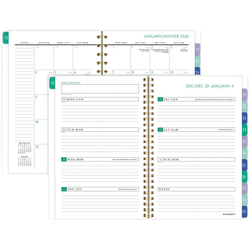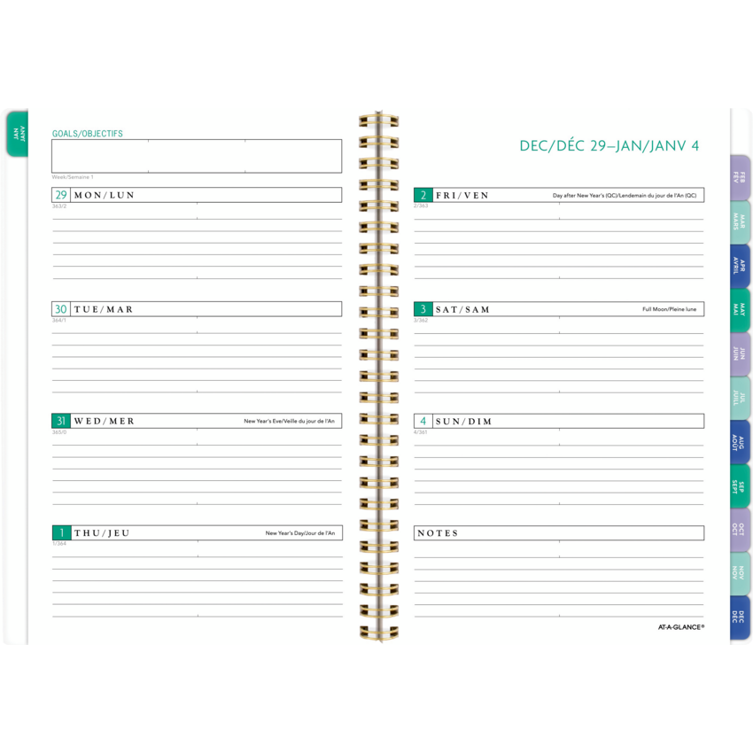 Gold twin wire bound. Poly cover with rose gold metallic accents. Weekly: 2 pages per week. Monthly: 2 pages per month. 13 months (January-January). Features open customizable space for weekly goals, lined weekly sections, coloured tabbed monthly pages with reference calendars and space for notes, a 3-year reference calendar and important dates, double-sided poly pocket, ink bleed resistant paper, and a full sheet of coordinated planning stickers. 8-1/2" x 6". Bilingual. Purple.