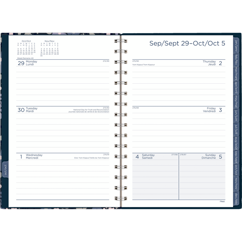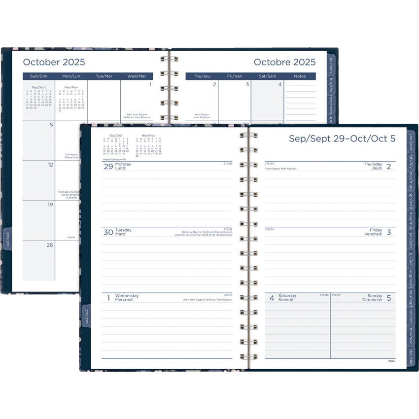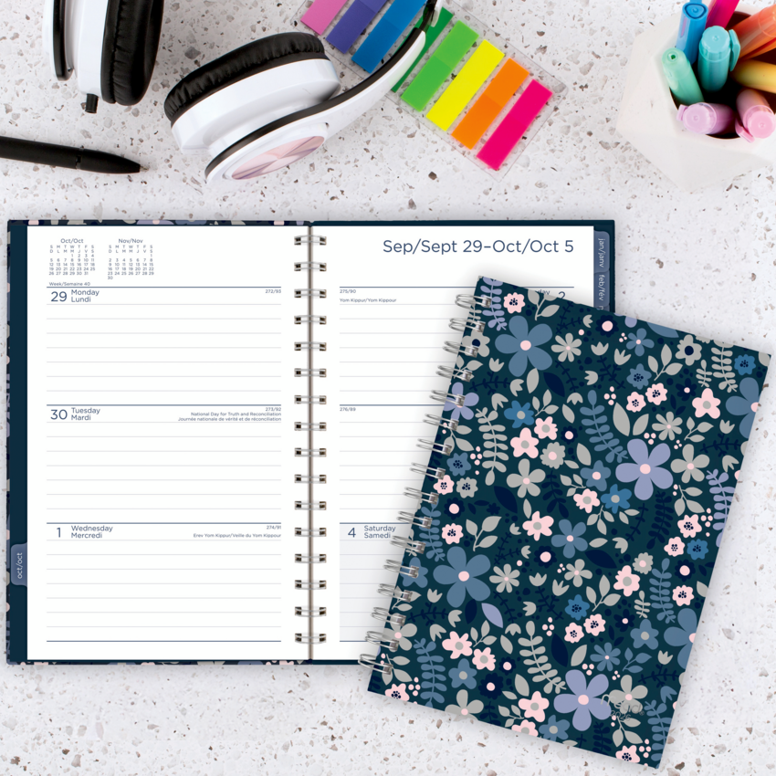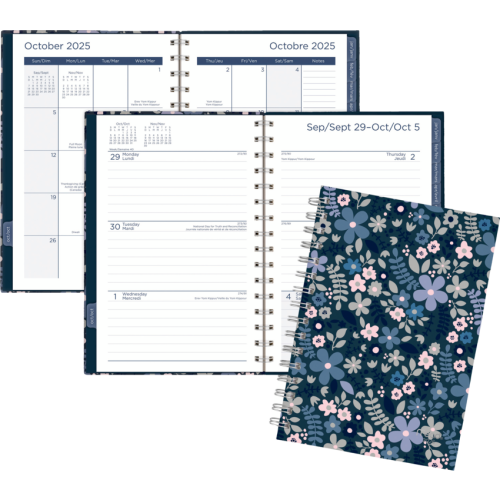 Twin coil bound. Sturdy hard covers with foil accents. 2 pages per week. 2 pages per month. 15 months October to December plus 3 monthly spreads. Tabbed monthly pages. Special pages include future planning pages, contacts, notes, passwords, holidays and reference calendars. 8-1/2" x 6". Bilingual. Blue.