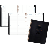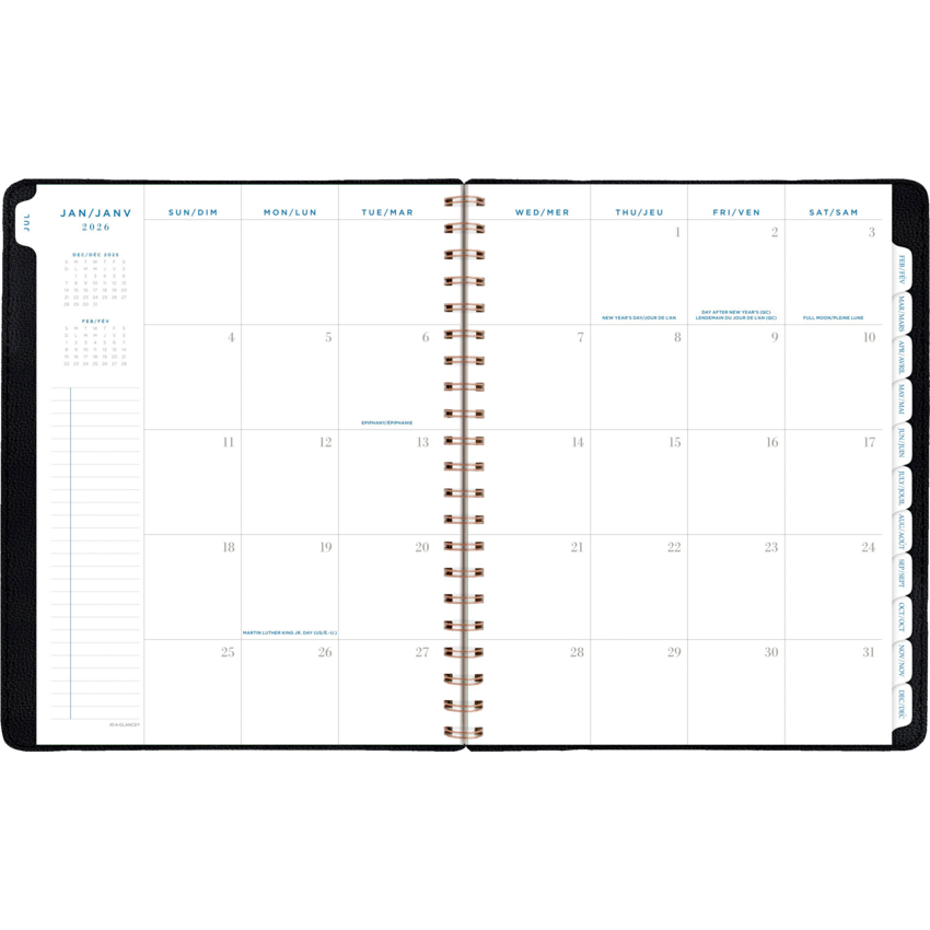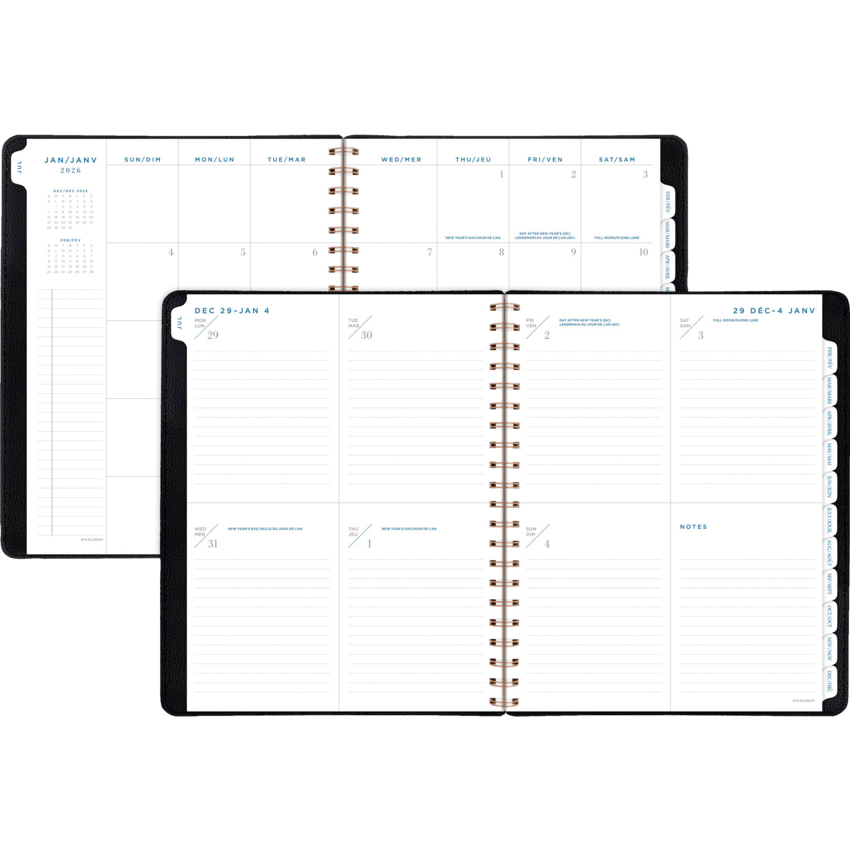 Twin coil wire bound. Flexible PU cover with bronze foil accents. 13 months January - January. 2 page per week, 2 page per month. Features tabbed monthly overviews with customizable notes section, lined weekly spreads, 3-year reference calendar with important dates, ink bleed resistant paper, and a double-sided poly pocket. 11-1/4" x 9". Bilingual. Black.