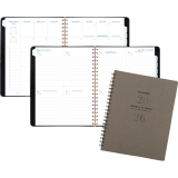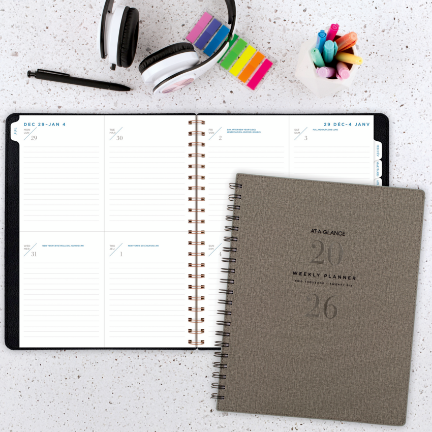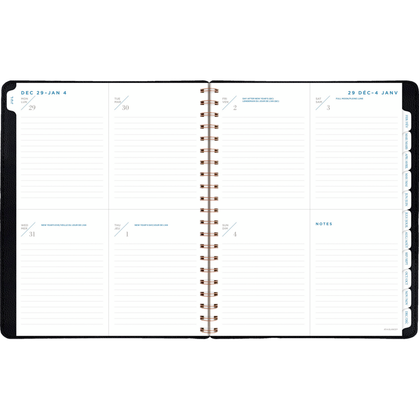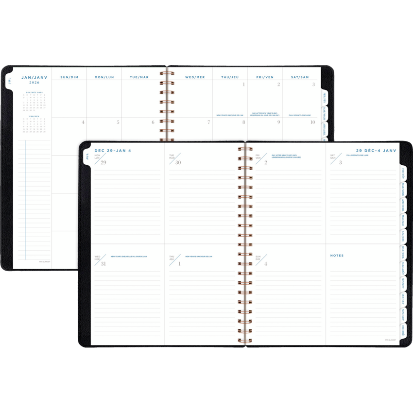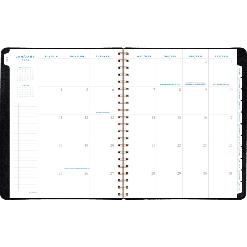 Twin coil wire bound. Flexible PU cover with black foil accents. 13 months January - January. 2 page per week, 2 page per month. Features tabbed monthly overviews with customizable notes section, lined weekly spreads, 3-year reference calendar with important dates, ink bleed resistant paper, and a double-sided poly pocket. 11-1/4" x 9". Bilingual. Grey.