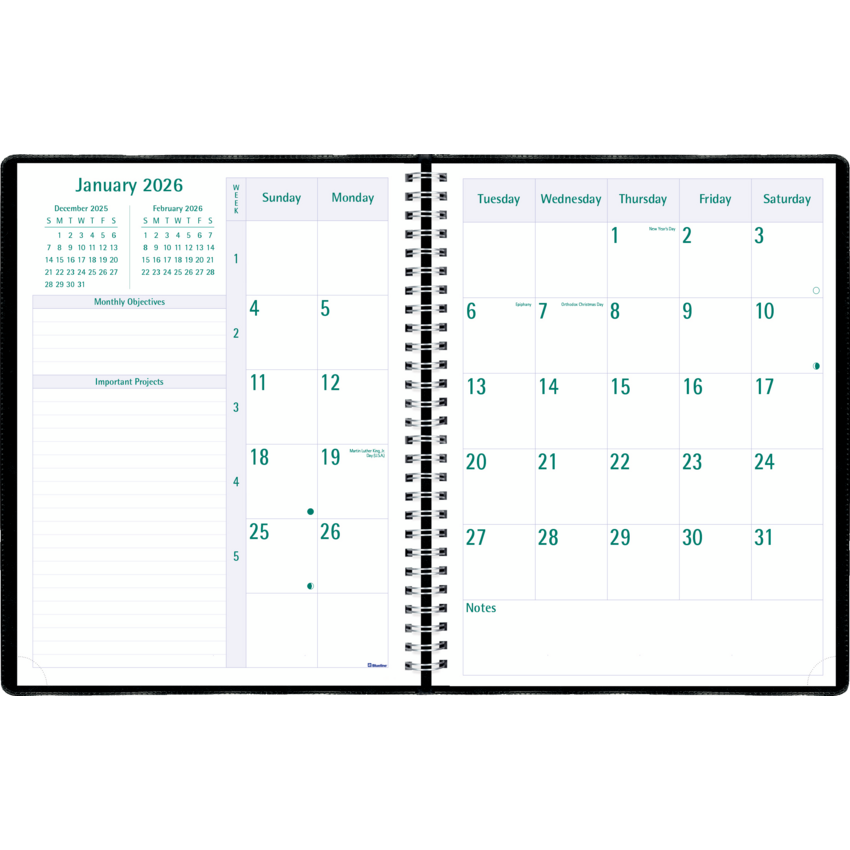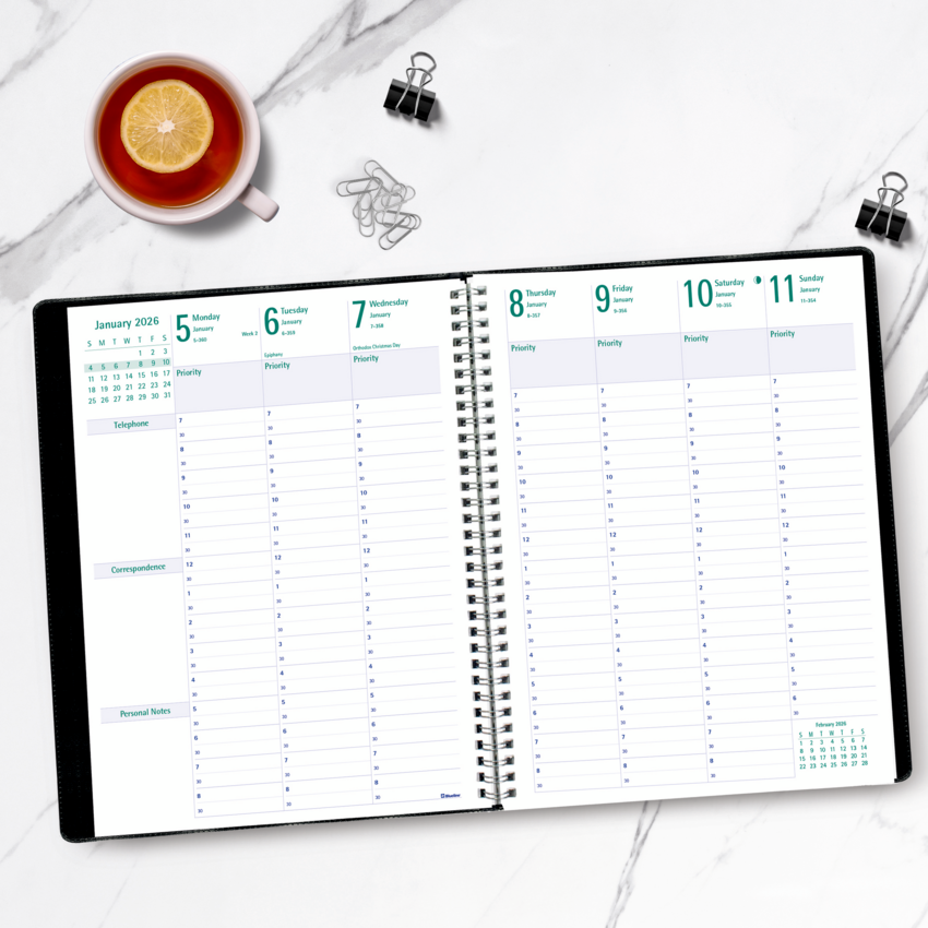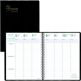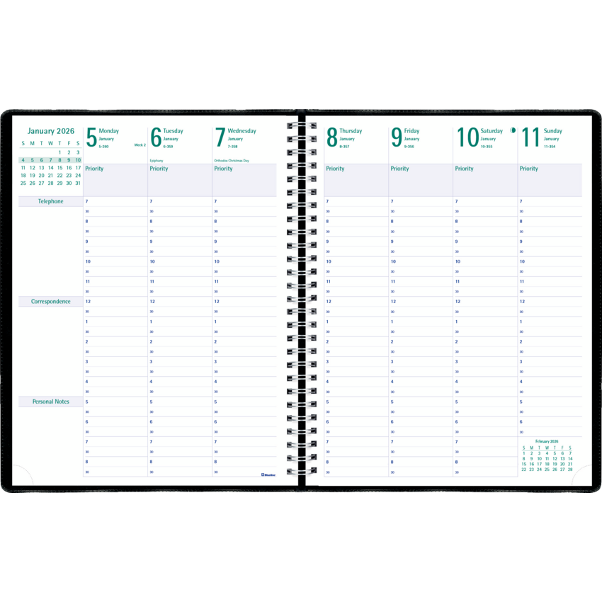 Telephone and address section included. Boxes for daily priorities, phone calls, correspondence and personal notes. FSC® Certified. Contains a minimum of 50% post-consumer recycled material. Twin wire bound. Soft, Castillan vinyl jacket. 1 week per 2-page spread. 13 months, December to December. 7:00 a.m. to 8:30 p.m. in 1/2 hour intervals. Monthly planner at beginning of each month. 11" x 8-1/2". English. Black.