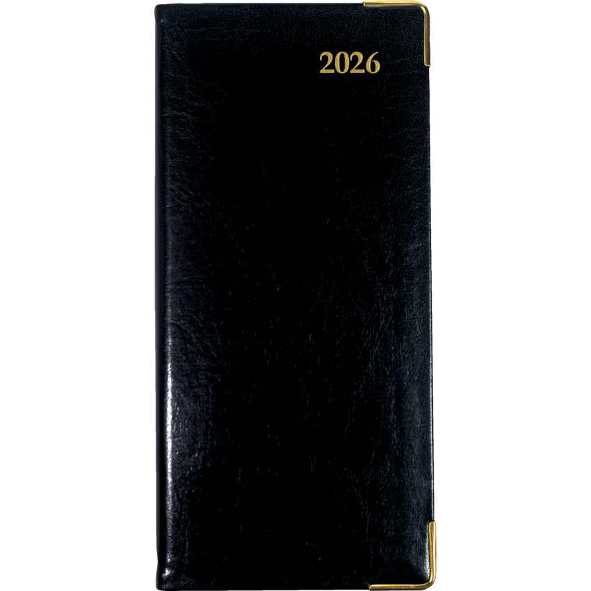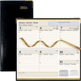 Flexible bonded leather cover. Sewn bound. Horizontal. 1 week per 2-page spread. 8:00 a.m. to 5:00 p.m. in 1 hour intervals. Gilded page edges. Gold corners. Ribbon bookmark. Telephone and address section. Calendars for current and following months on each spread. Shaded priorities and note boxes on each spread. Coloured world map. 6-3/4" x 3-1/4". Trilingual. Black.
