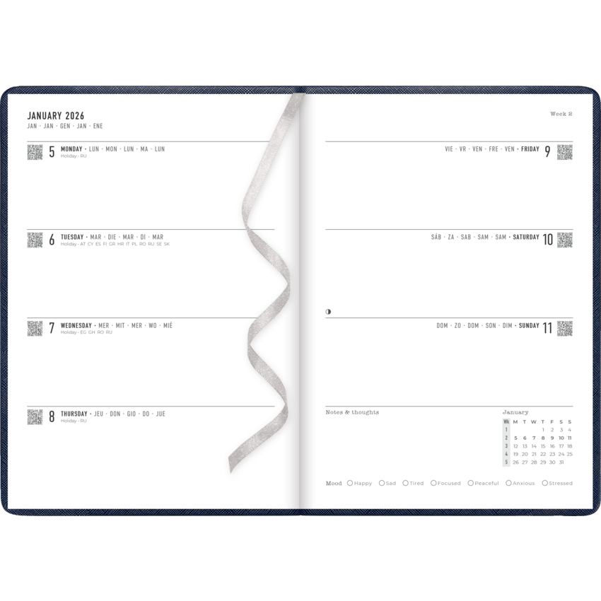 Download the free Letts® app and just plan, scan, click and go. Sewn bound. Textured, faux-leather cover. Week to view planner with ruled space for each day. Monthly calendar before each month. 12 months January to December. Social diary style, ribbon page marker/bookmark, and corner elastic closure. 8-1/4" x 5-7/8". Multilingual. Midnight.