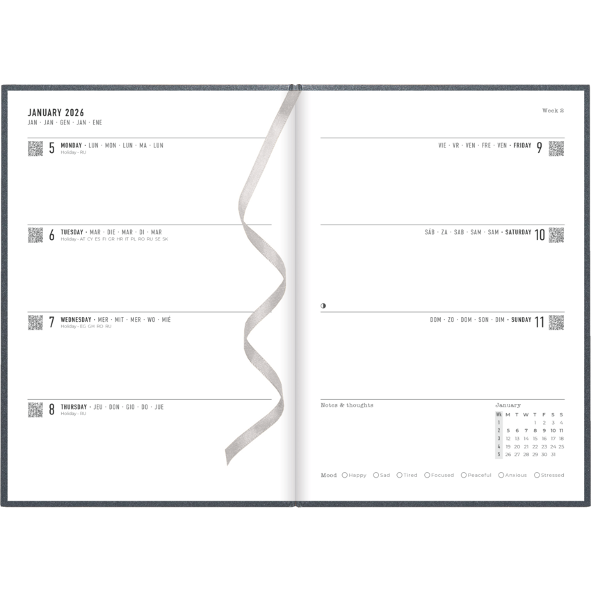 Download the free Letts® app and just plan, scan, click and go. Sewn bound. Metallic matte paper hard cover. Week to view planner. Monthly planner before each month. 12 months January to December. Timeless diary style, ribbon page marker/bookmark, white paper from sustainable sources. 8-1/4" x 5-7/8". Multilingual. Charcoal. Download free reminder app to plan, scan, click and go.