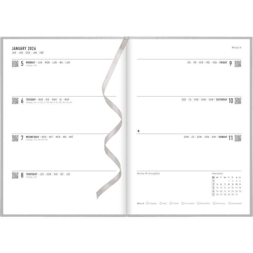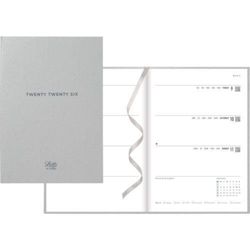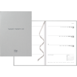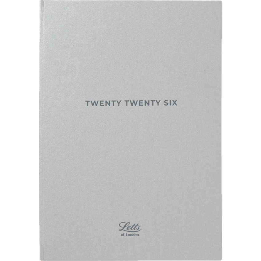 Download the free Letts® app and just plan, scan, click and go. Sewn bound. Metallic matte paper hard cover. Week to view planner. Monthly planner before each month. 12 months January to December. Timeless diary style, ribbon page marker/bookmark, white paper from sustainable sources. 8-1/4" x 5-7/8". Multilingual. Silver. Download free reminder app to plan, scan, click and go.