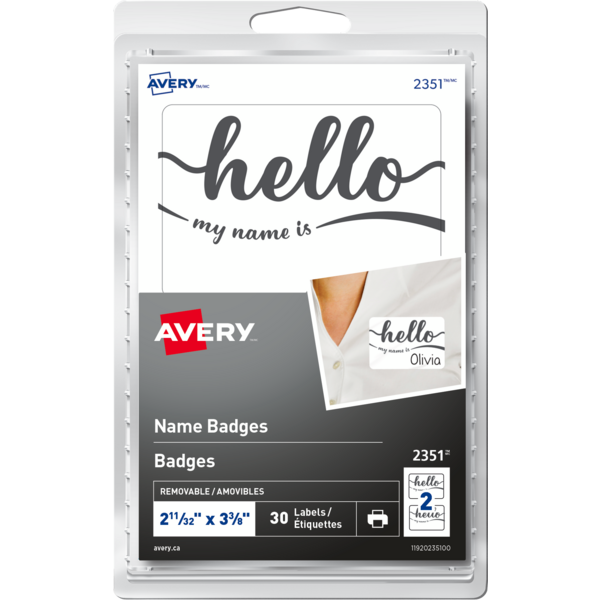 Predesigned to creatively display your name. Flexible adhesive badges moves with clothing and won't fall off or curl. Customize using the easy and free Avery® Design & Print Online software. Hello...my name is. Laser and inkjet compatible. Can also be handwritten. 2-11/32” x 3-3/8”. English. 30/pkg.