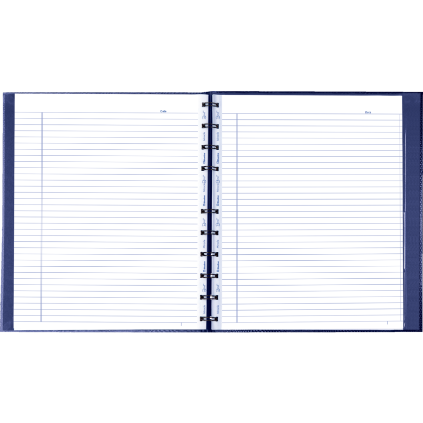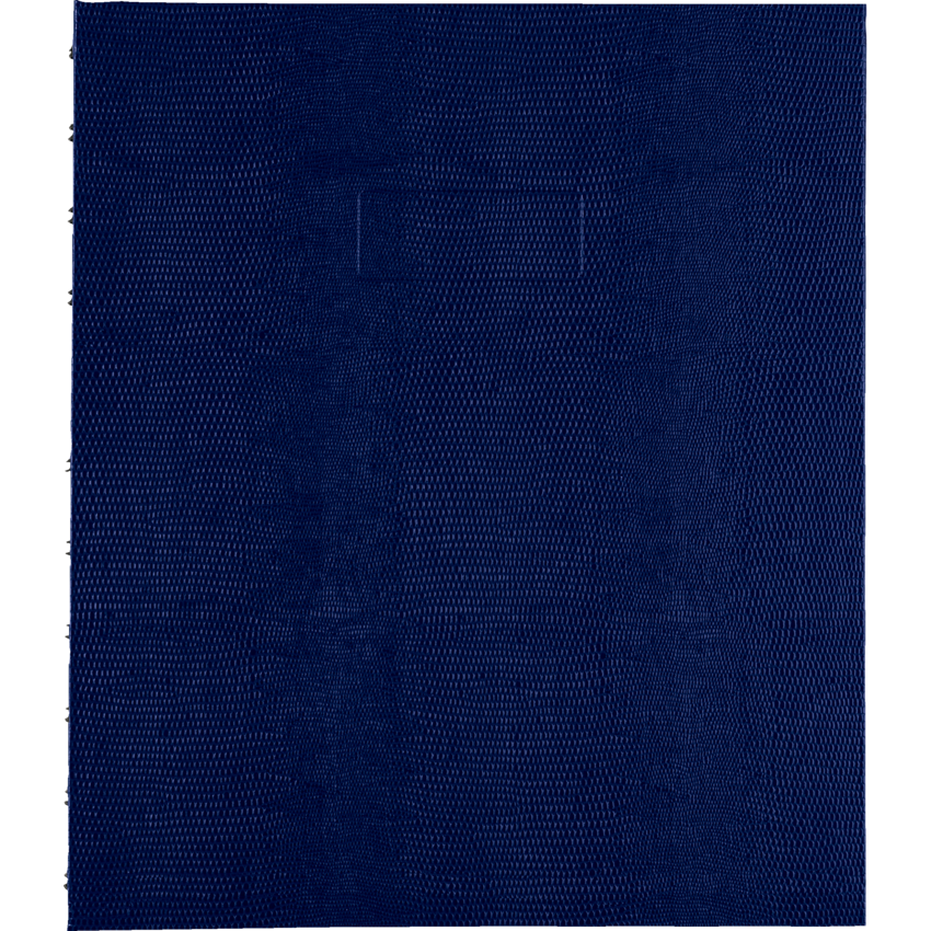 Contains a minimum of 50% post-consumer recycled material. FSC® Certified. Twin wire bound. Hard, lizard-like cover. Ruled pages with margin. Features removable micro-perforated pages, self-adhesive tabs and index sheet. 150 pages. 11" x 9-1/16". Includes bonus MiracleBind™ quad pages and storage pocket. Indigo Blue.