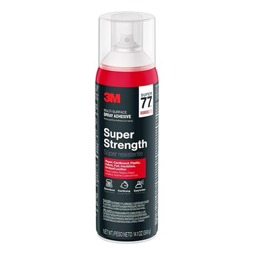 Versatile and flexible, our 3M™ Super 77™ Multi-Surface Spray Adhesive forms a strong, permanent bond on many surfaces, from art projects to light-duty repairs around your home. Make a mistake while positioning your materials? No problem. You can reposition as necessary within 2-3 minutes of application per the instructions on can to achieve the perfect look. Dries quickly once in place. Say goodbye to glues that soak through and ruin your project. Provides excellent adhesion. Achieve a strong bond on your light-duty bonding projects with 3M™ Super 77™ Multi-Surface Spray Adhesive. Contains 1,1-difluoroethane.