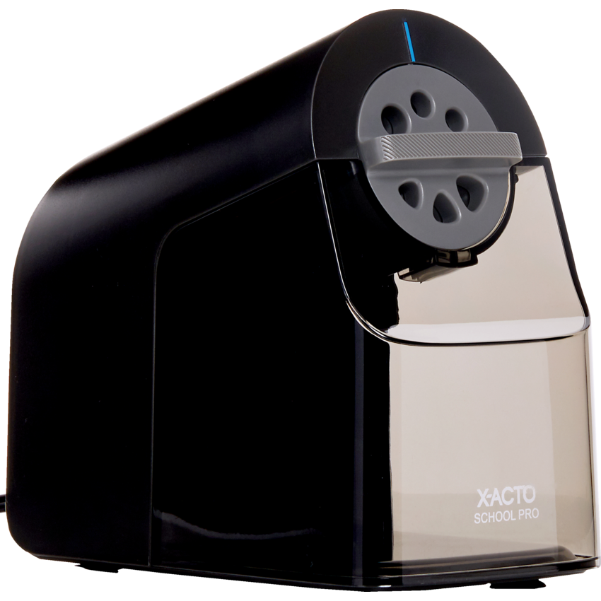 Operates quietly for less disruption. Hardened steel cutters sharpen pencils to a rounded point while the patented FlyAway system prevents over sharpening. Will not operate unless receptacle is properly closed, and automatically shuts off to prevent overheating 6-size dial fits nearly every pencil. SafeStart® motor stops when shavings bin is full. 10-year limited warranty. Black.
