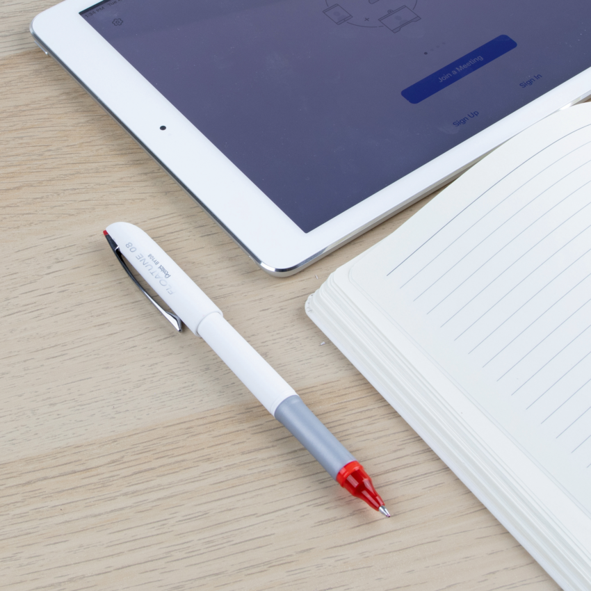 Dual ball mechanism inside pen tip allows for maximum ink flow. All-matte white body provides a clean and sophisticated look to match a high-quality minimalist aesthetic. Water based, oil infused ink formula writes smoothly and won't skip. Textured grip. 0.8mm. Red.